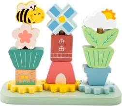 A Malomkert fa rakosgatós játék ideális 12 hónapos kortól. Tartalmaz színes bükk anyagú fa darabokat, amelyeket a gyerekek könnyen rakosgathatnak. A kreatív szórakozást elemek, mint például virágok, fák, szélmalmok és méhek nyújtják, amelyek a rudakra helyezhetőek az alaplapon.