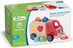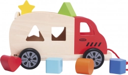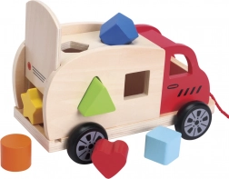A formaválogató teherautó élénk színeivel és játékos formatervezésével felkelti gyermeke érdeklődését. A kamionhoz hat bedobható forma tartozik. A gyerekek először a kockákat a megfelelő nyílásokba helyezik. A kockák kivételéhez ki kell húzni a plató hátsó ajtaját. A kamion elejére egy piros zsinór van erősítve, amely lehetővé teszi, hogy a gyerekek maguk után húzzák az autót.