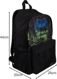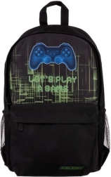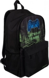 A belső tér tágas főrekeszt kínál párnázott laptopzsebbel, apróságoknak való elülső, rejtett cipzáras zsebet és két oldalsó hálós zsebet palacknak vagy esernyőnek. A modern, kontrolleres gamer grafika egyedi megjelenést ad a hátizsáknak, ami minden gamingrajongónak tetszeni fog.
