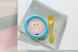 Könnyű tálka praktikus peremmel és gyerekkanál, melyek segítenek a gyerekeknek a baba valódi etetésének utánzásában.