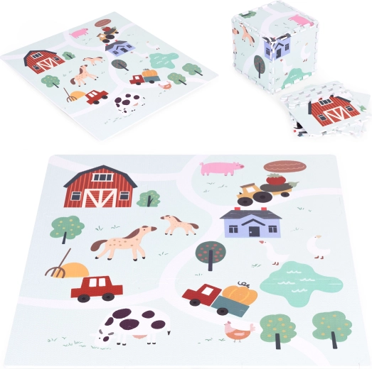 A vidám, farm témájú minta állatokkal, csűrrel és utakkal serkenti a képzeletet és az érzékszervi fejlődést. A 21 elemből stabil játszófelület állítható össze, és a „fogazott” szegélyelemekkel egyszerű 3D formák is építhetők. Az EVA anyag kellemes tapintású, csúszásgátló és könnyen tisztítható – elég egy nedves ronggyal áttörölni.