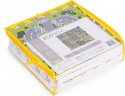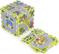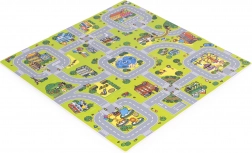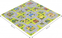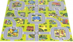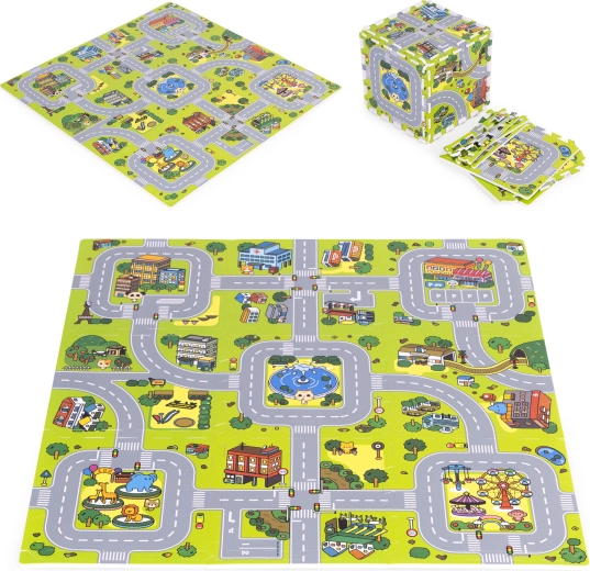 Az összeállított szőnyeg tágas kisvárost kínál utakkal és parkokkal. Ideális kisautózáshoz, jelenetek építéséhez és a közlekedési szabályok játékos tanulásához.