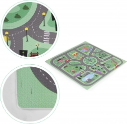 Az utak, kereszteződések és városi elemek részletgazdag mintája arra ösztönzi a gyerekeket, hogy történeteket találjanak ki, kisautókkal játszanak, és fejlesszék képzelőerejüket és finommotorikájukat.