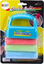 Kreatív szórakozás a szabadban praktikus tartóval: ez a készlet három vastag járdakrétát tartalmaz intenzív színekben, valamint egy könnyű, ergonomikus tartót, amely lehetővé teszi három színnel egyszerre rajzolni, és feltűnő, többszínű vonalakat alkotni. A színek könnyen leöblíthetők vízzel, így a játék tiszta és biztonságos.
