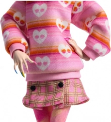 A Monster High x Wednesday kollekció a sorozatból ismert sötét humort és hangulatot dicséri. Enid Sinclair bátran keveri a mintákat: a csíkos pulóver, a kockás szoknya és a színes harisnyák ikonikus kinézetté olvadnak össze.