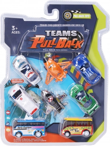Nyolc visszahúzható közlekedési eszköz készlet 7 cm, különböző variánsok, szórakozás gyerekeknek és motorikus fejlődés.