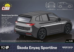 Az Építőkészlet Skoda Enyaq Sportline egy 1:35 méretarányú kicsinyített modell, amely híven visszaadja az eredeti Škoda Enyaq iV karakterisztikus formáit. Forgatható kerekekkel rendelkezik gumiabroncsokkal, amelyek ideálisak a játék közbeni mozgáshoz. Ez a modell nemcsak gyermekeket, hanem felnőtt építőkészlet-rajongókat, gyűjtőket és autórajongókat is elbűvöl.