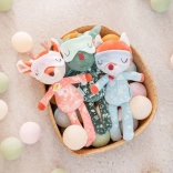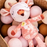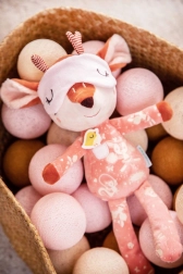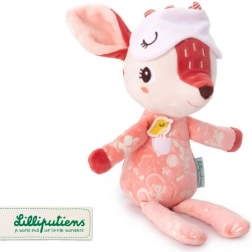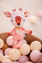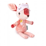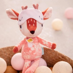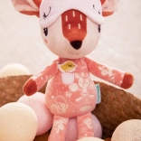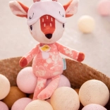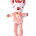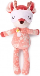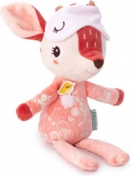 Stella őzike téglás-rózsaszín árnyalatú ruhácskát visel zsebecskével és madárka applikációval, melyek támogatják a taktilis és vizuális észlelést. Az alvómaszk a szemre húzható, és lekapcsolt fény mellett világít a sötétben, ami biztonságot és nyugalmat áraszt elalvás előtt. A játék igényes kivitelű, puha és kíméletes az érzékeny bababőrhöz.