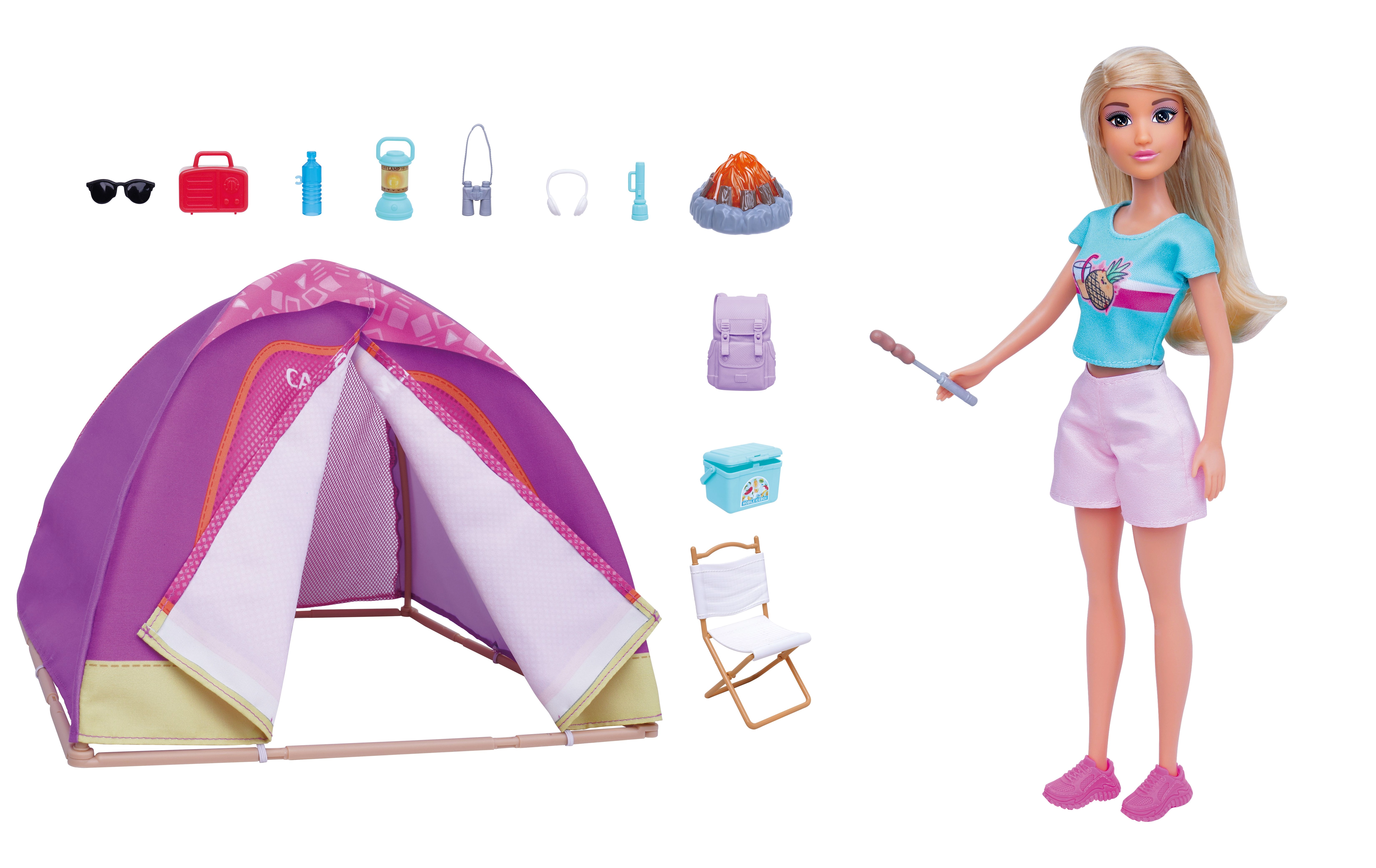 Ez a kempingszett babával rengeteg játéklehetőséget kínál – a sátor felállításától a táborhely előkészítésén át egészen a sütögetésig a világító tűzrakóhellyel. A baba levehető ruhával és kiegészítőkkel érkezik, könnyen kézben tartható, és ideális önálló vagy közös játékhoz.