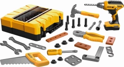Szórakoztató és praktikus gyermek szerszámkészlet hordozható bőröndben, amely mindent kínál a kis barkácsolóknak. Tartalmaz egy fúrót fényhatásokkal, gazdag tartozékkészletet és kényelmes hordozhatóságot a kompakt 26 × 9 × 25,5 cm-es méreteknek köszönhetően.