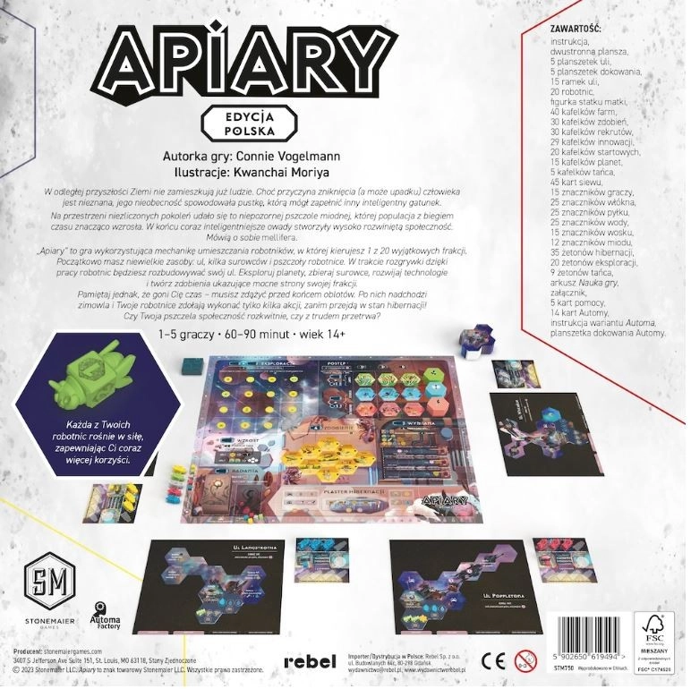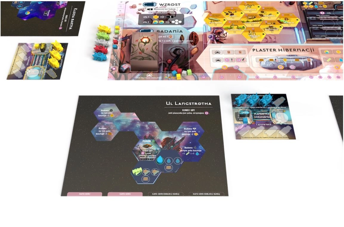A csomag tartalma gazdag és kínál: kétoldalas játéktáblát, kaptár táblákat, figurákat, kártyákat és sok mást, ami hosszú játékélményt biztosít 1-5 játékos számára.