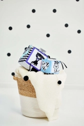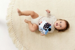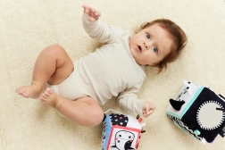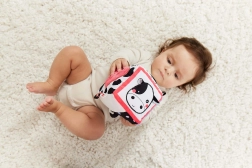 A fekete-fehér motívumok magas kontrasztja színes részletekkel stimulálja a látást és játék közben fenntartja a baba figyelmét.