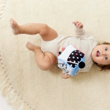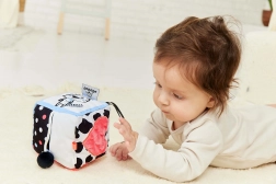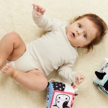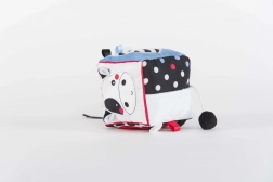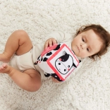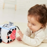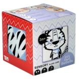Ez a pihe-puha szenzoros kocka a legkisebb felfedezőknek készült. A hat oldal mindegyike más-más érzékszervi élményt kínál – a kontrasztos fekete-fehér mintáktól színes akcentusokkal a változatos textíliákig és felületekig, amelyek tapintásra és felfedezésre hívnak. A bájos tehén és tigris motívumok felkeltik a kíváncsiságot, és segítenek a formák és érzelmek megismerésében.