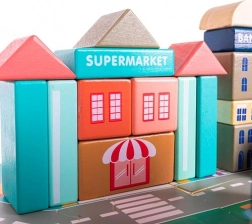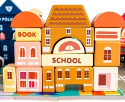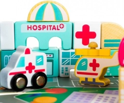 A gazdag felszereltség olyan épületeket tartalmaz, mint a iskola, kórház, tűzoltóállomás, rendőrség, bank, könyvesbolt, szupermarket, múzeum és kávézó, valamint 7 járművet (rendőrség, tűzoltóság, mentő, taxi, iskolabusz, autó, helikopter). A faelemek gondosan csiszoltak, az élek lekerekítettek, a festékek nem mérgezőek – ideális a biztonságos gyerekjátékhoz.