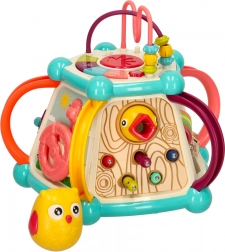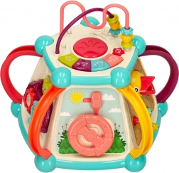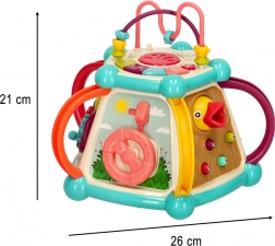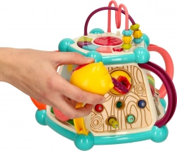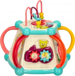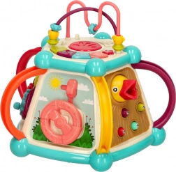 A zongora, a kormány és a forgó kerekek ösztönzik a kreativitást és a fantáziát, miközben erősítik az ujjak ügyességét. A kocka minden oldala új tevékenységet kínál.