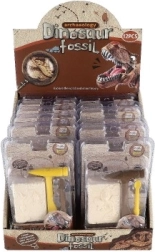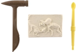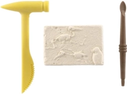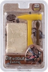 A csomag tartalmazza a dinoszaurusz csontváz lenyomatával ellátott blokkot és az ásatáshoz szükséges eszközöket - műanyag kalapácsot és vésőt.