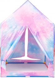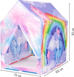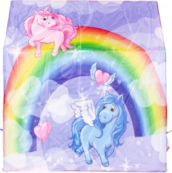 Színes, házikó alakú gyerek sátor, amely varázslatos játszóteret teremt otthon és a szabadban egyaránt. Könnyű szerkezete gyors összeszerelést és egyszerű hordozhatóságot biztosít, a feltekerhető bejáratok pedig biztonságos és kreatív játékot támogatnak. A vidám unikornis- és szivárványmotívumok minden gyermeket elvarázsolnak.
