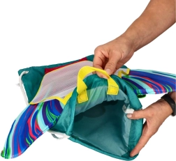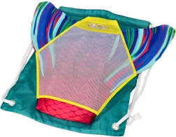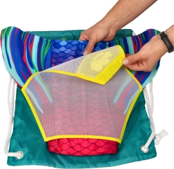 A hálós részek és a levegős anyag segítik a tartalom gyorsabb száradását úszás után, így a zsák hamar újra használatra kész.
