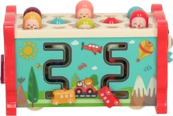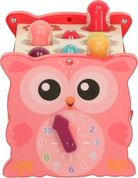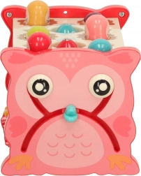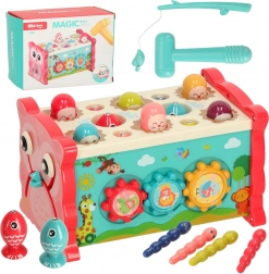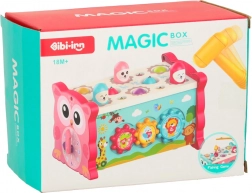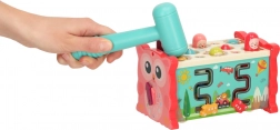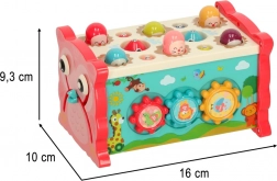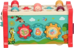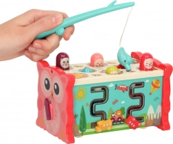 Ez az interaktív, rózsaszín oktató játék többféle tevékenységet egyesít egy kompakt dobozban. A gyerekek kalapáccsal beüthetik a „vakondokat”, a mellékelt bottal színes halacskákat és kukacokat foghatnak, forgathatják a színes kerekeket, tologathatják az autókat a labirintusban, és megismerkedhetnek az óra alapjaival. A vidám színek és barátságos illusztrációk támogatják az érzékszervi stimulációt és az örömteli játékot.