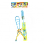 Műanyag parittya kilőhető repülővel. A repülő AG13 elemmel működő kis lámpával rendelkezik, az elemek a csomag tartozékai. Tasakban csomagolva. A csomag mérete kb. 9×21×2 cm. Ajánlott életkor: 3+