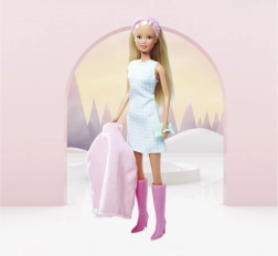 Fedezze fel a STEFFI LOVE baba időtlen stílusát, több mint 30 éves hagyománnyal. Ez a divatikon imádja az elegáns szetteket és a modern frizurákat. A Cape Fashion kiadásban puha, plüss pelerinben, finom, kékes pepita ruhában és összeillő rózsaszín kiegészítőkben ragyog – hajpántban, csizmában és kis borítéktáskában.
