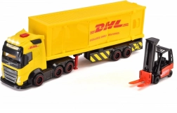 Volvo kamion a DHL futárszolgálat hivatalos licencével. Fény- és hangeffektek, nyitható és mozgatható részek. A csomag része egy targoncát és rakodódobozok. Hossz: 35 cm.