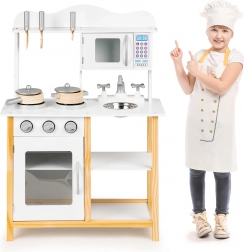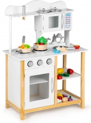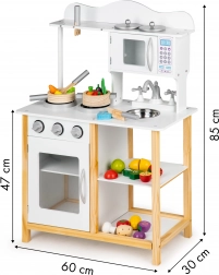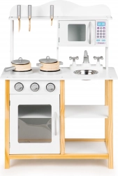 Az Ecotoys fa játékkonyha 3 éves kortól ajánlott. Minőségi kivitelezése és nagyfokú stabilitása biztonságos és szórakoztató játékot nyújt. A sütő és a mikrohullámú sütő ajtaja nyitható, míg a forgógombok valósághű kattogó hangokat adnak.