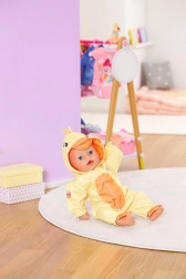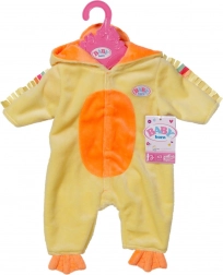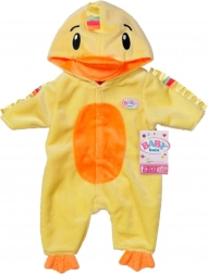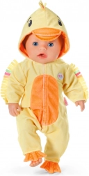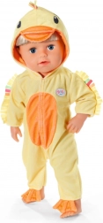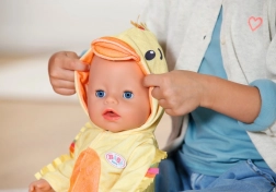 A puha, kacsás overál a 43 cm-es BABY born babákhoz ölelgetni való kalanddá varázsolja a játékot. A csőrös kapucni, a kontrasztos narancssárga pocak és a „úszólábacskák” aranyos megjelenést adnak, miközben az elülső cipzár megkönnyíti az átöltöztetést és a finommotorika gyakorlását.
