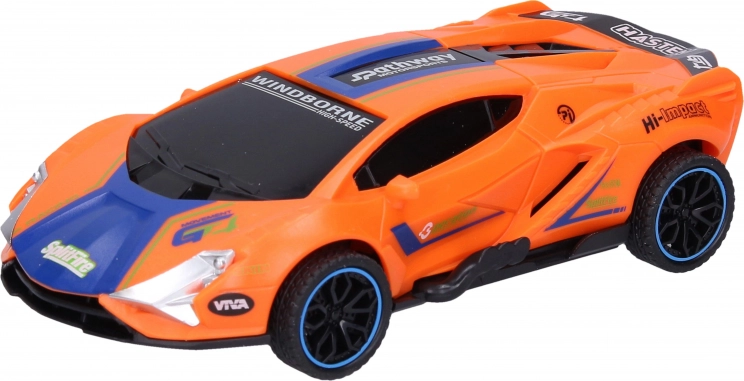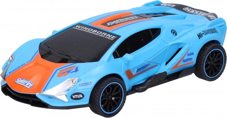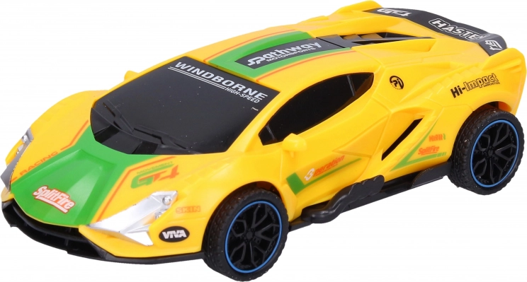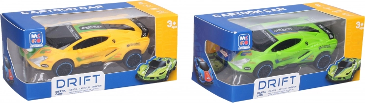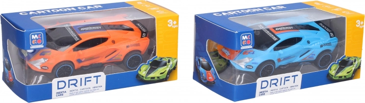 Driftelő versenykisautó lendkerékkel, 15,5 × 8 × 4 cm méretben. Elég megindítani, és az alváz közepén merőlegesen elhelyezett kis keréknek köszönhetően magától driftel. Elérhető 4 színben – kék, zöld, narancssárga, sárga; szórakozás elemek nélkül.