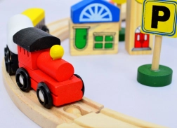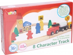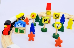 - Fa sínek, mágneses kapcsolású mozdony kocsikkal, figurák, autó, épület, közlekedési táblák