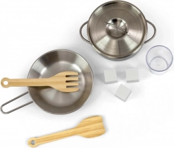 A csomag tartalma: fém serpenyő, fedeles fazék, fa lapát és villa, átlátszó pohár és 3 jégkocka. A konyha a állítható hosszabbító lábelemeknek köszönhetően a gyerekkel együtt nő, így hosszú éveken át örömteli játékot biztosít.