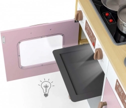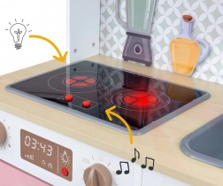 A főzőlap főzési hangokkal és háttérvilágítással, a sütő világítással és kattogó tekerőkkel igazi szakácsélményt nyújt a gyerekeknek.