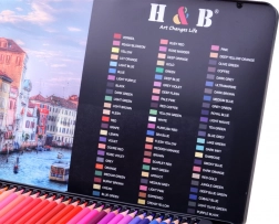 A ceruzák fém tokkal vannak ellátva művészi motívummal és az angol színnevekkel, ideális hordozhatósághoz és tároláshoz.