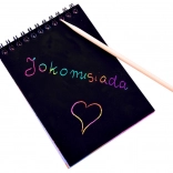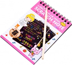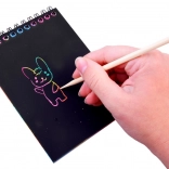 Szórakoztató és kreatív kaparós készlet 3 éves kortól: kompakt A6-os notesz 10 fekete oldallal és rejtett szivárványos háttérrel. A mellékelt fa rajzeszközzel a gyerekek könnyedén készítenek képeket, mintákat és feliratokat, amelyek lekaparás után élénk színekben ragyognak. Támogatja a finommotorikát, a kreativitást és a kéz–szem koordinációt otthon, az iskolában és útközben.