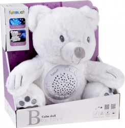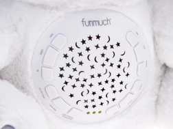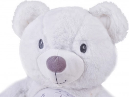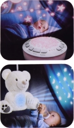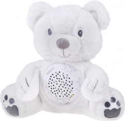 Ez a puha fehér mackó egyesíti a játékot és az éjszakai fényt. A 6 lágy altató és az 5 autentikus természet-hang segít megnyugtatni a babát és biztonságérzetet ad. A színes csillag- és holdvetítő megnyugtató atmoszférát teremt a falakon és a mennyezeten, elűzi a félhomályt és támogatja a nyugodt alvást.