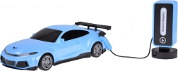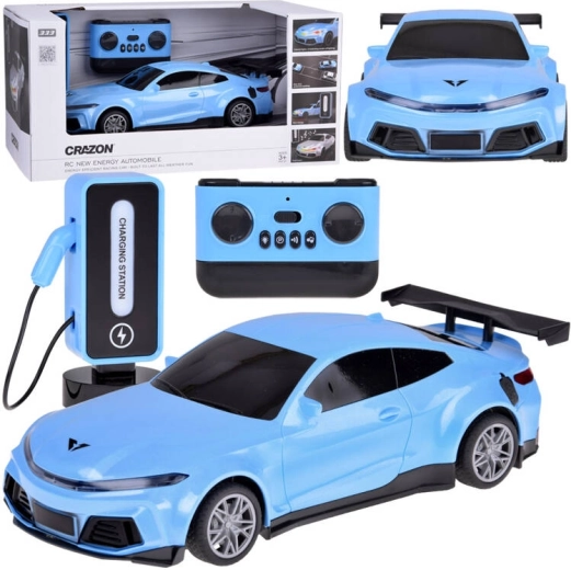 Kék RC versenyautó valósághű részletekkel és töltőállomással, akárcsak az elektromos autóknál – minden kis sebességrajongót lenyűgöz. Kínál előre/hátra haladást, jobbra/balra kanyarodást, automatikus parkolást, fényhatásokat 5 módban, valamint dudát és zenét. A csomagban tölthető akkumulátor található az autóhoz és az állomáshoz, valamint egy intuitív vezérlő.