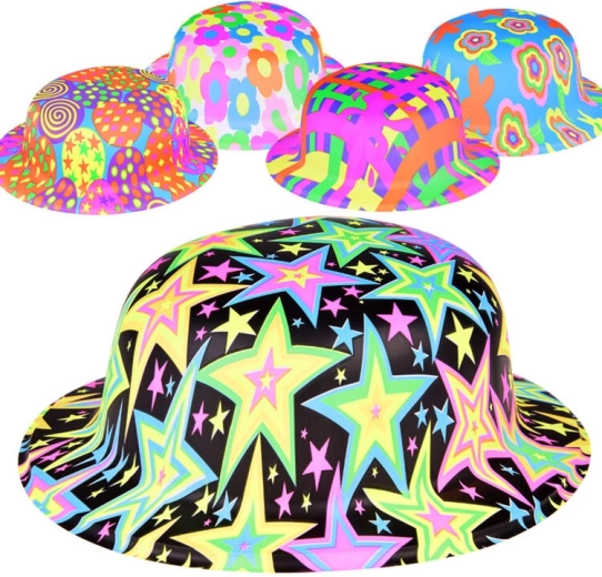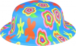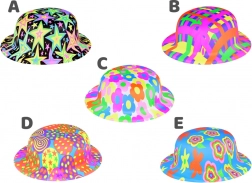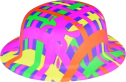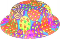 Ez a vidám, színes mintákkal díszített kalap tökéletes választás bármilyen bulira. Rugalmas műanyagból készül, ezért jól illeszkedik és könnyen tisztítható. A feltűnő színek és motívumok felkeltik a figyelmet, játékos stílust adva a rendezvénynek.