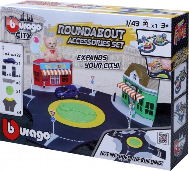 Bburago City körforgalom 1:43: játékszett 34 elemmel, utakkal, kiegészítőkkel és autómodellel. Kompatibilis a további Bburago City szettekkel.