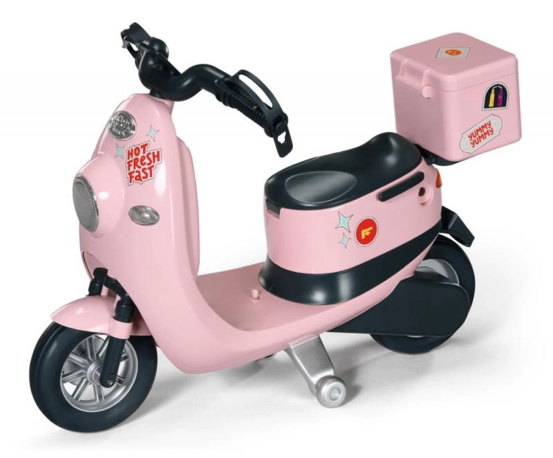 A szett része egy töltőállomás szerepjátékhoz – csatlakoztatáskor felgyullad a hátsó lámpa (nem valódi töltés). A hátsó tárolódoboz helyet kínál apróságok „kézbesítéséhez”, a matricák feldobják a robogó megjelenését, a stabilizáló kerekek pedig kényelmes haladást biztosítanak játék közben.