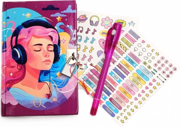 A mágikus fényű zenei napló 40 vonalazott oldalt tartalmaz. Kemény borítója LED fényekkel díszített, és lakattal zárható. Tartozékai: 2 ív matrica és egy kétvégű toll. Az egyik végén hagyományos tinta, a másikon láthatatlan tinta található, amely csak a toll speciális „zseblámpájával” látható.