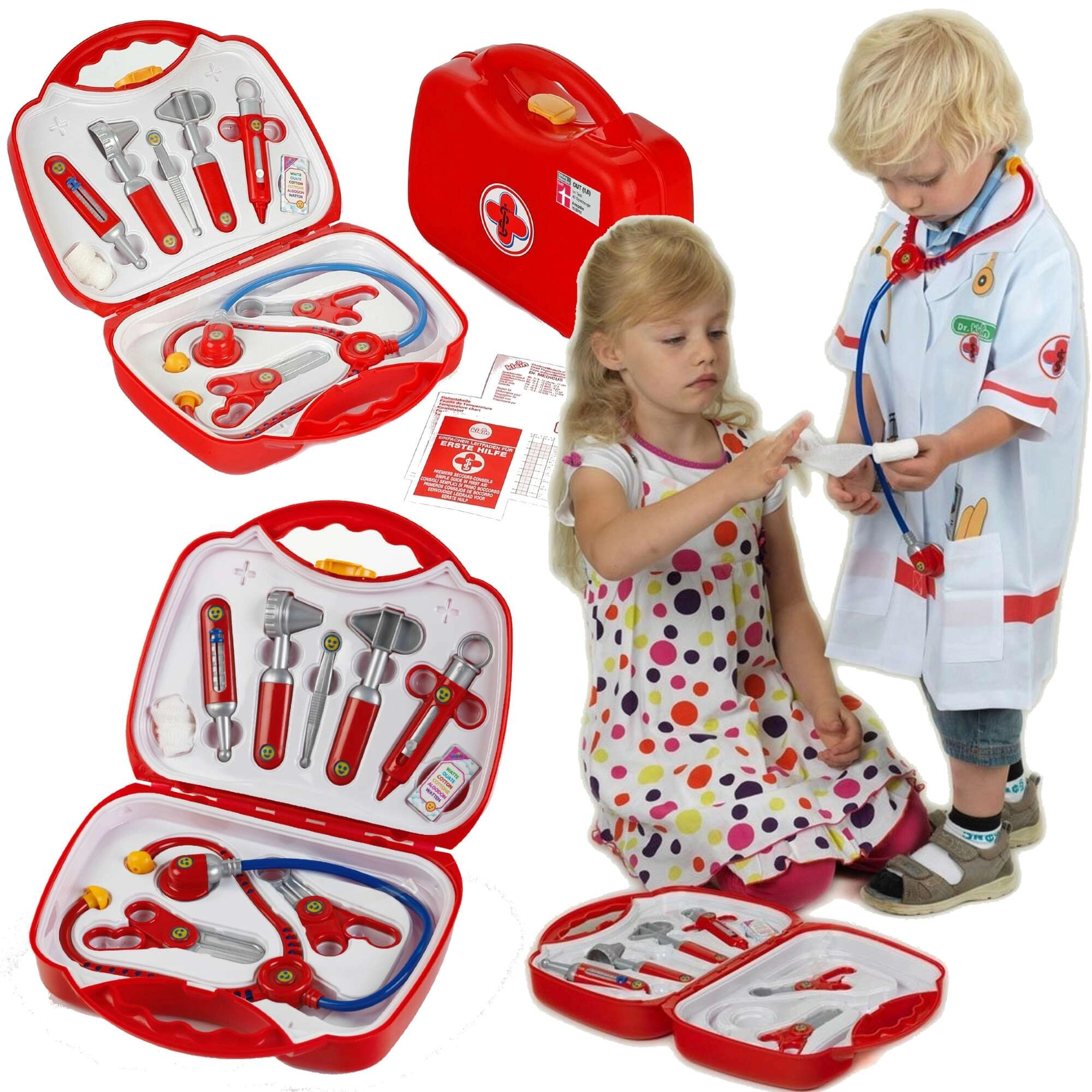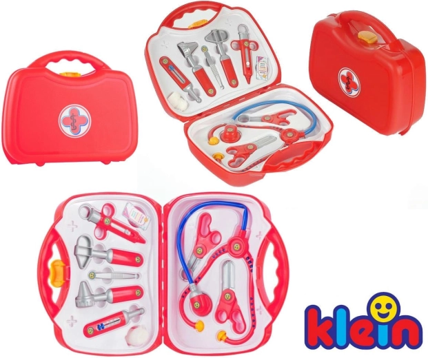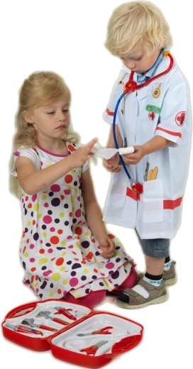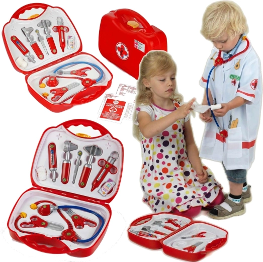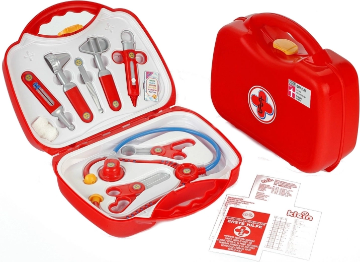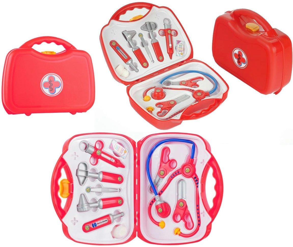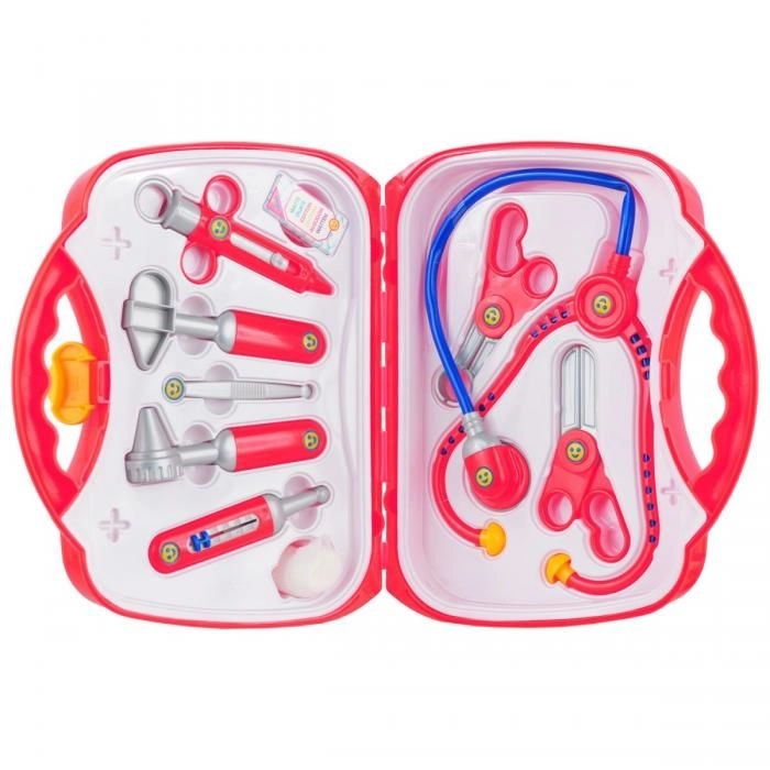 A készlet 10 valósághű, mégis biztonságos eszközt tartalmaz piros–ezüst kivitelben: sztetoszkóp, olló, kis fogó, fecskendő, hőmérő, otoszkóp, csipesz, doboz fültisztító pálcikának és pólya. Minden elem éles élek nélküli, és tartósságra és biztonságra tervezett.