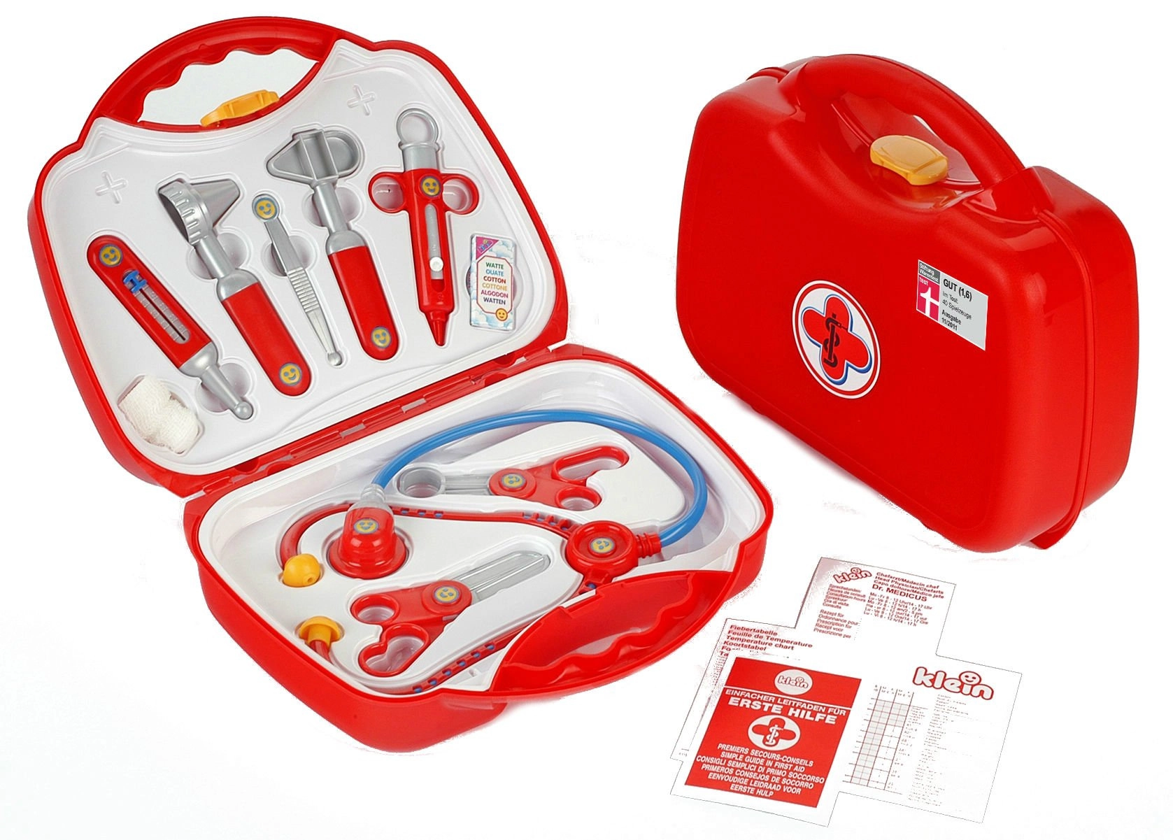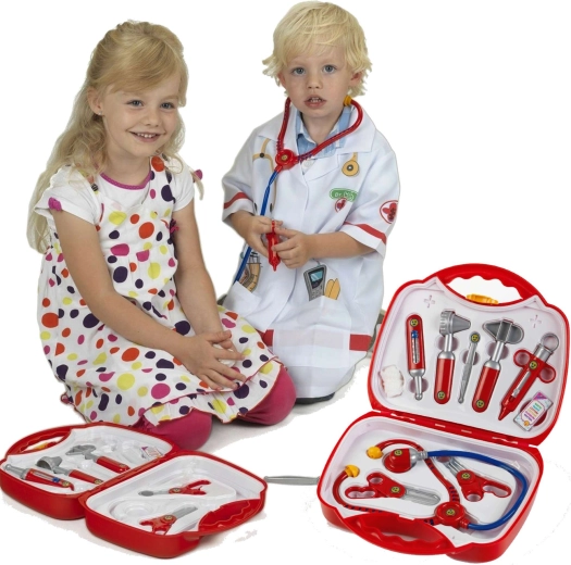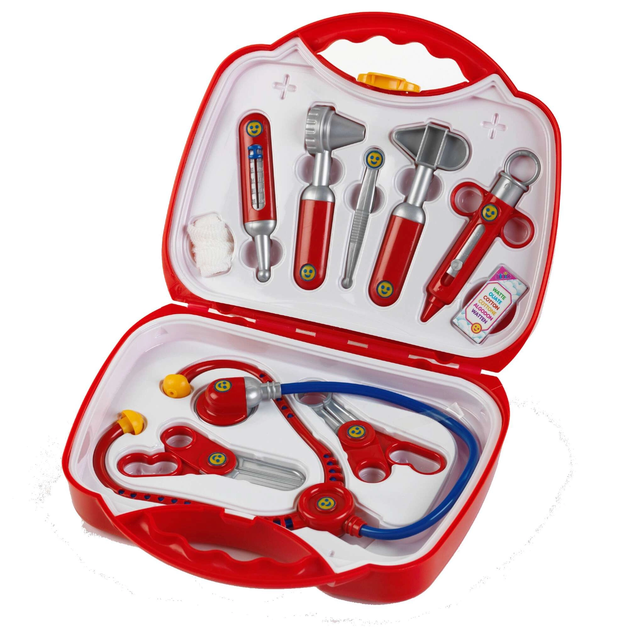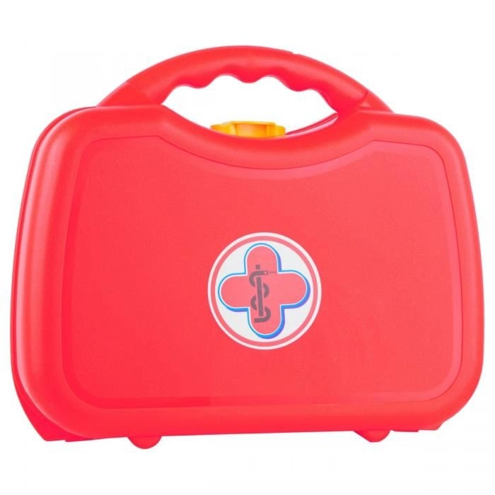 A készlet 10 valósághű, mégis biztonságos eszközt tartalmaz piros–ezüst kivitelben: sztetoszkóp, olló, kis fogó, fecskendő, hőmérő, otoszkóp, csipesz, doboz fültisztító pálcikának és pólya. Minden elem éles élek nélküli, és tartósságra és biztonságra tervezett.