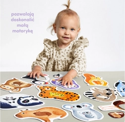 Első puzzle Mama és én kiváló oktatási készlet a legkisebb felfedezők számára és nagyszerű ötlet az első kirakókhoz. 11 nagy, két részes puzzle-t tartalmaz lyukkal. A játék célja különböző formájú darabok illesztése a nyílásokba.