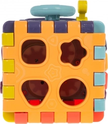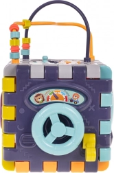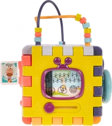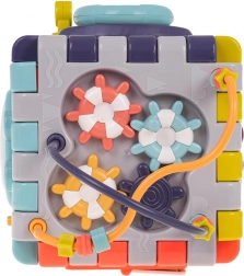 A felső rész fogaskerekeket és gyöngyöket kínál a kéz–szem koordináció gyakorlásához. Az alakválogató 4 színes elemmel támogatja az alakfelismerést és a logikus gondolkodást. A kocka tartós műanyagból készült élénk színekben, kialakítása pedig ösztönzi a felfedezést és az önálló játékot.