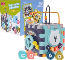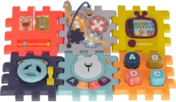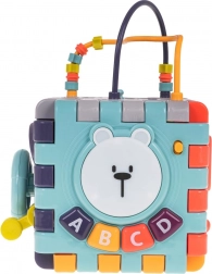 Ez az okos gyerekkocka könnyen síkká nyitható, így a gyermek az egyes panelekkel külön-külön is játszhat. Az interaktív panel a mackóval világító fejével és A, B, C, D gombjaival dallamokat játszik és angol betűket tanít. Találsz rajta kormányt „váltókarral”, csúszkákat, forgó elemeket és egy kis forgatható könyvecskét is.