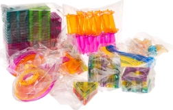 - 139 építőelem (beleértve 71 mágnesest), 6 golyó, dekoratív matricák, képes útmutató, doboz formaválogató tetővel és fogantyúval