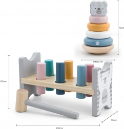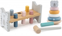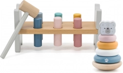 A készlet két játékot kínál 12 hónapos kortól – egy piramist és egy ütögetőt, mindkettő bájos mackó motívummal. A gyerekek logikus sorrendben rakhatják egymásra a piramis színes gyűrűit, míg az ütögető játéknál a mellékelt kalapáccsal lehet a színes pálcikákat beütni. Szükség esetén az ütögetőt meg lehet fordítani a játék folytatásához.