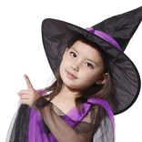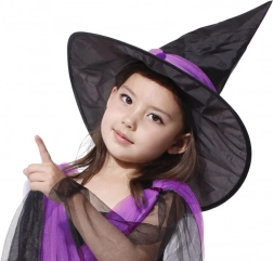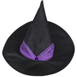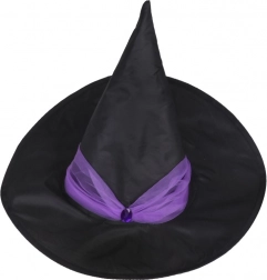 Klasszikus fekete kalap lila díszítéssel, amely tökéletesen kiegészíti a jelmezt és fokozza a boszorkányos hangulatot.