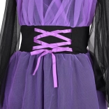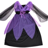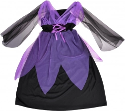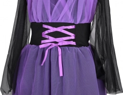 Változtasd a kis parádéskodót titokzatos boszorkánnyá! A fekete és lila ruha légies tüllréteggel és díszítő fűzéssel a felsőrészén feltűnő, mégis kényelmes jelmezt alkot. A könnyű textil kellemes viselet, nem korlátozza a mozgást, így egész estére remek választás.
