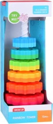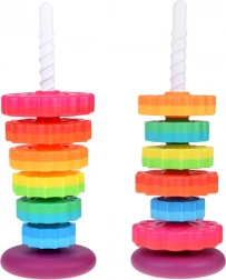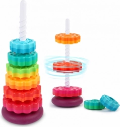 Ez a színes spirál torony elbűvöli a gyerekeket élénk színeivel és a karikák spirál rúdon történő finom lecsúszásával. Játék közben a gyerekek természetes módon fejlesztik a fogást, a mozdulatok pontosságát, és megtanulják megkülönböztetni a méreteket. A tartós műanyagnak és a stabil alapnak köszönhetően a játék biztonságos és intuitív.